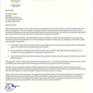 "After reviewing (the State Board of Elections- SBE) Report on June 2 Election & Recommendations for November 3 Elections, I remain concerned about the series of failures that -- while not intended -- potentially resulted in disenfranchisement and suppression of primary voters. Thousands of Marylanders either did not receive their ballots or received erroneous or late ballots, and thousands more stood in lines for many hours on primary day. This was and remains completely unacceptable."